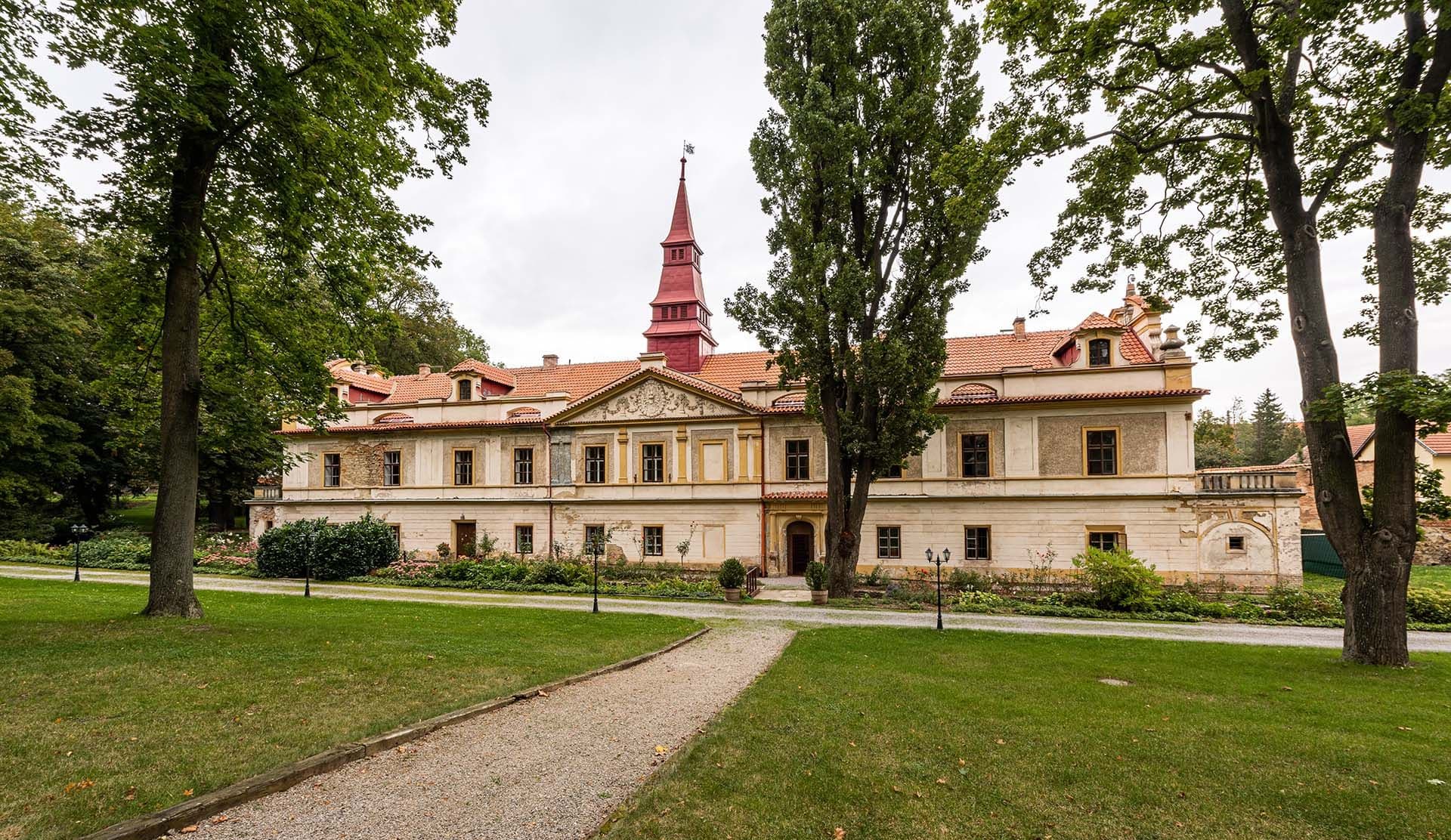 Historická dominanta obce obklopená zelení, která dodává místu jedinečnou atmosféru.